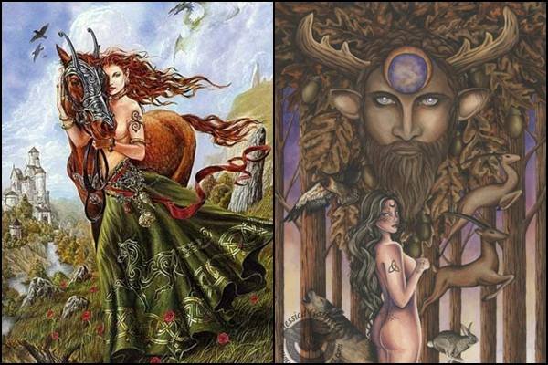 - Cernunnos: Um dos mais antigos Deuses celtas, encontrado tanto entre os celtas continentais como os insulares. Deus da fertilidade, dos animais, do amor físico, da natureza, dos bosques e da abundância. Seu nome é pronunciado como se tivesse um "k" - Kernunnos. É representado por um homem sentado na posição de lótus, cabelo comprido, de barba, nu e usando apenas um torque (colar celta) no pescoço ou ainda por um homem de chifres, como no Caldeirão de Gundestrup, que tem os seguintes símbolos: um torque em sua mão direita e a serpente na mão esquerda, rodeado por um veado à sua direita e um javali à sua esquerda. Cernunnos é o Guardião do Mundo Verde, conhecido como Green Man.